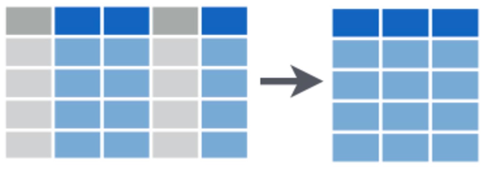 If you are familiar with regular expressions, you can use the match helper function. For example, to select those same two columns, we could use ^ to indicate the column name starts with the following characters and $ to indicate the column name ends with the preceding characters.