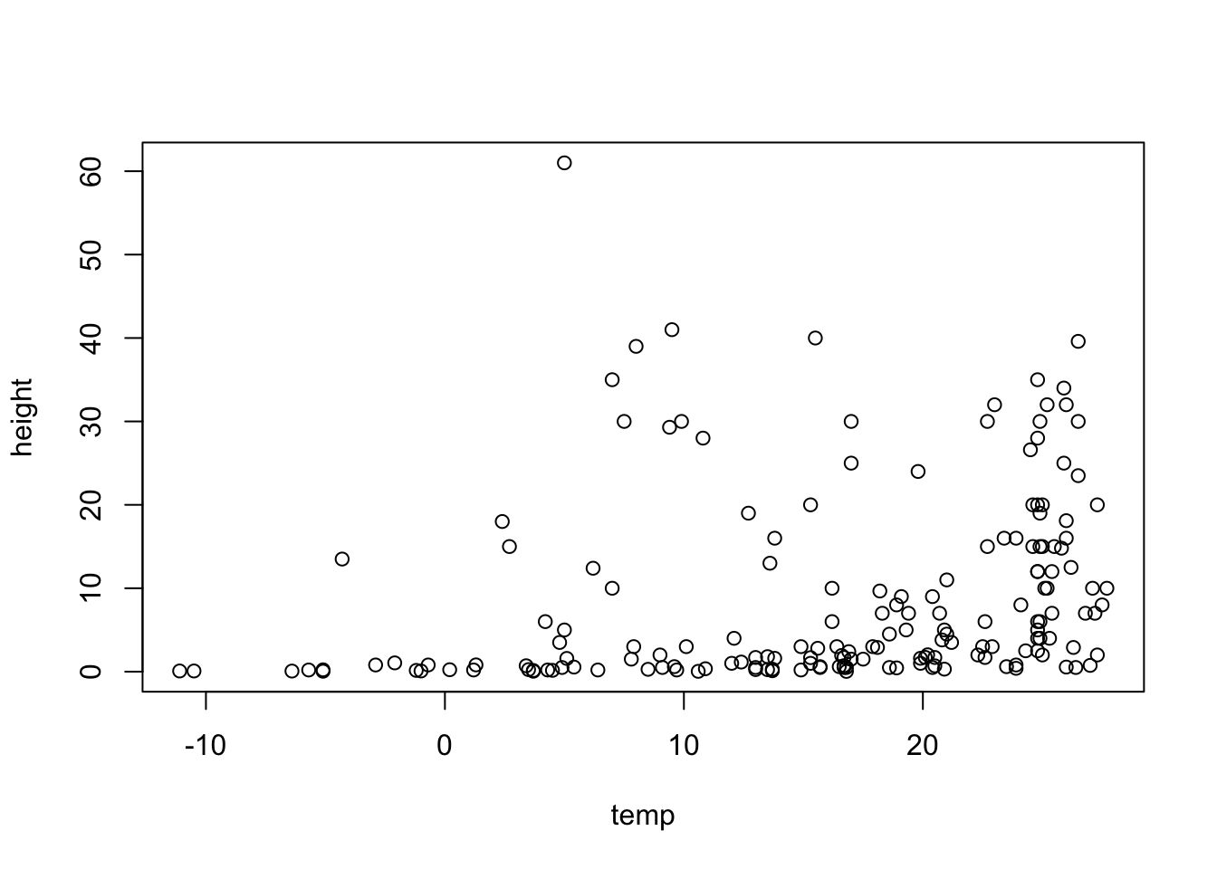 plot(height ~ temp, data = Plant_height, xlab = "Temperature (°C)", ylab = "Plant height (m)", ylim = c(0, 80), xlim = c(-20, 30))