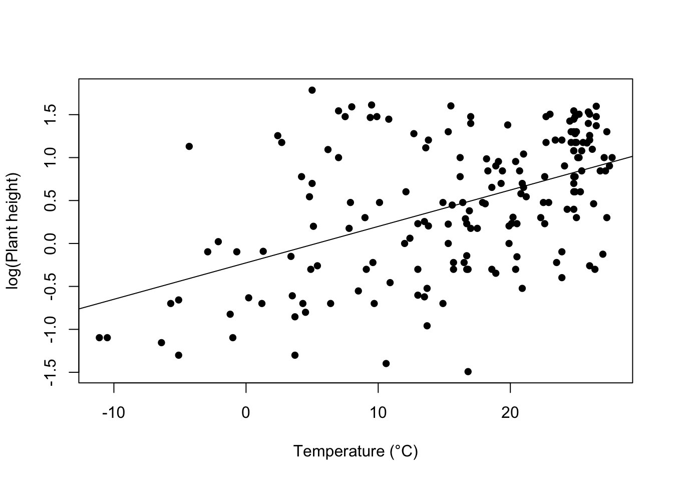 plot(loght ~ temp, data = Plant_height, xlab = "Temperature (°C)", ylab = "log(Plant height)", pch = 16)