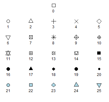 The choice of symbols to use in plotting is extensive and choices are accessed using the pch argument in the graphical parameters. Type ?pch to see all the choices.