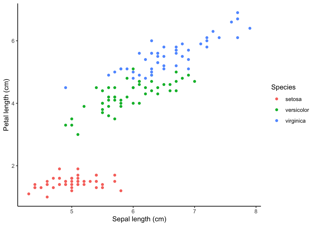 These points could then be coloured according to the levels of a categorical variable. To do this, add colour="categorical.variable" in the aes brackets. To colour by species, we would use: