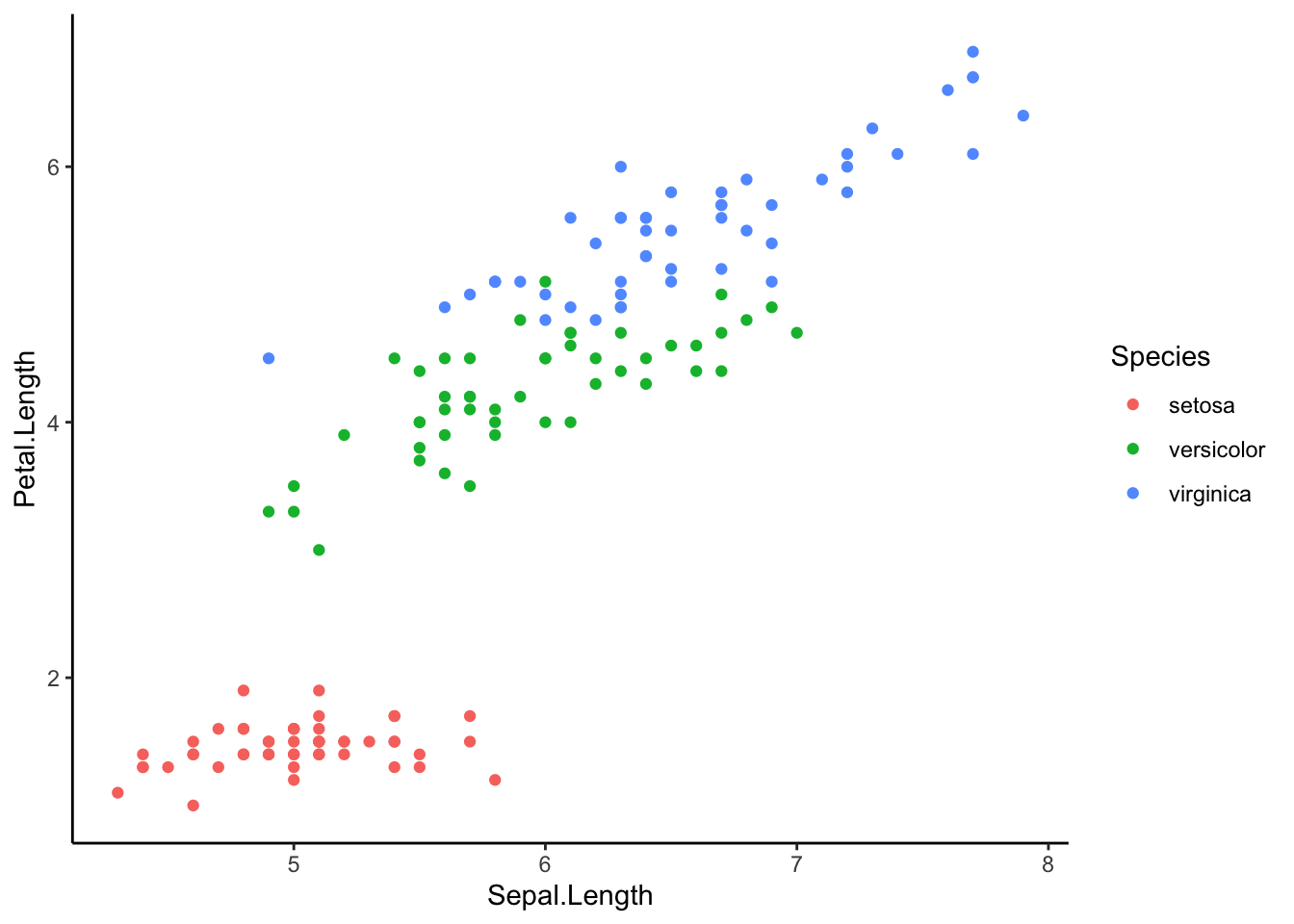 plot6 <- ggplot(iris, aes(Sepal.Length, Petal.Length, colour = Species)) +