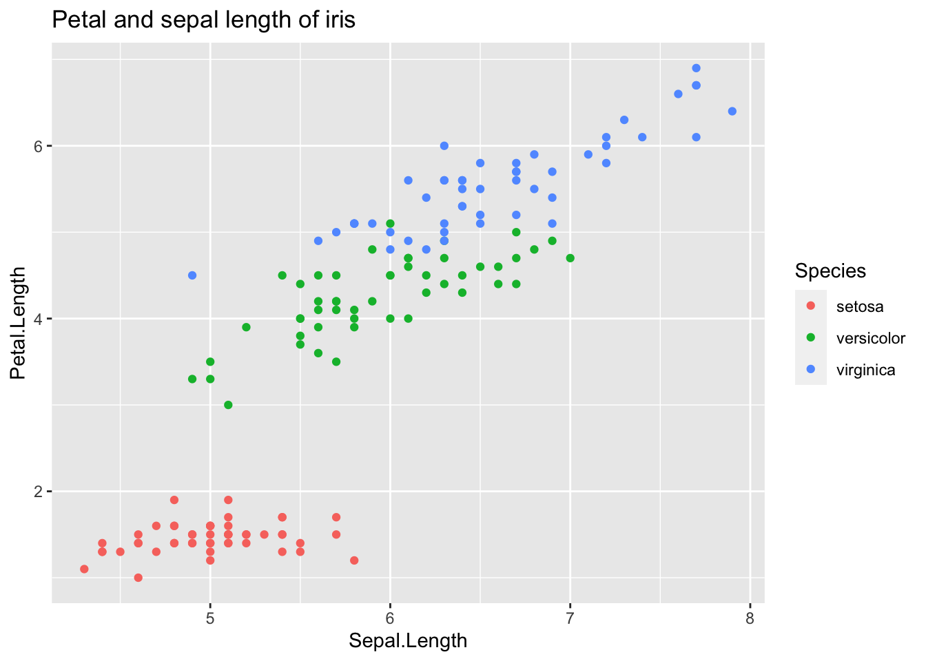 print(IrisPlot + ggtitle("Petal and sepal length of iris"))