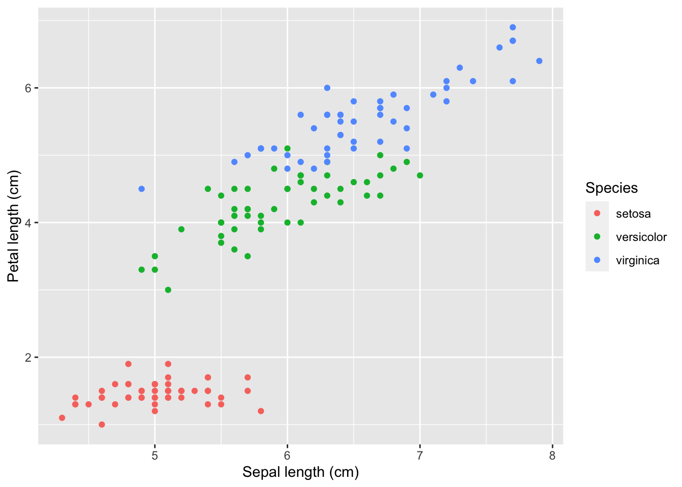 print(IrisPlot + labs(y = "Petal length (cm)", x = "Sepal length (cm)"))