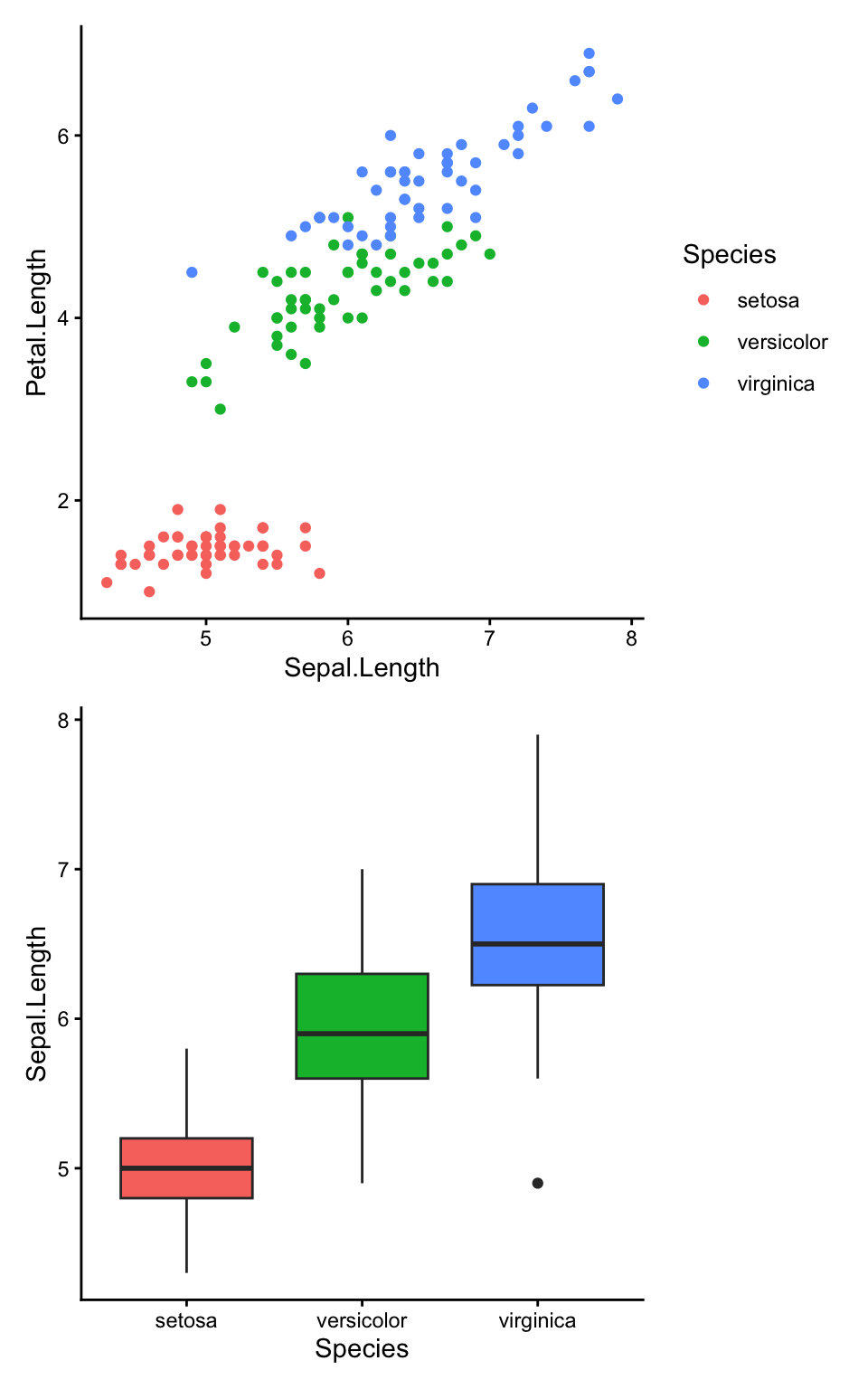 p2 <- ggplot(iris, aes(Species, Sepal.Length, fill = Species)) +
