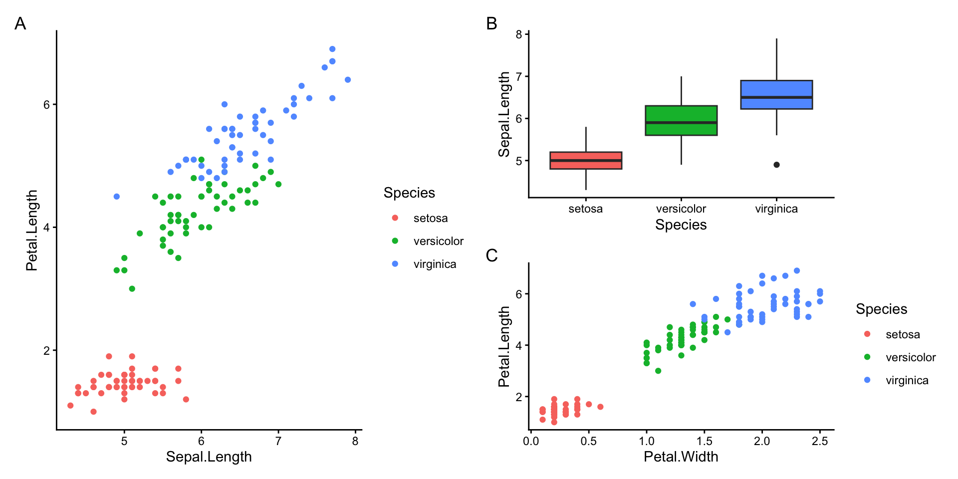 p3 <- ggplot(iris, aes(Petal.Width, Petal.Length, colour = Species)) +