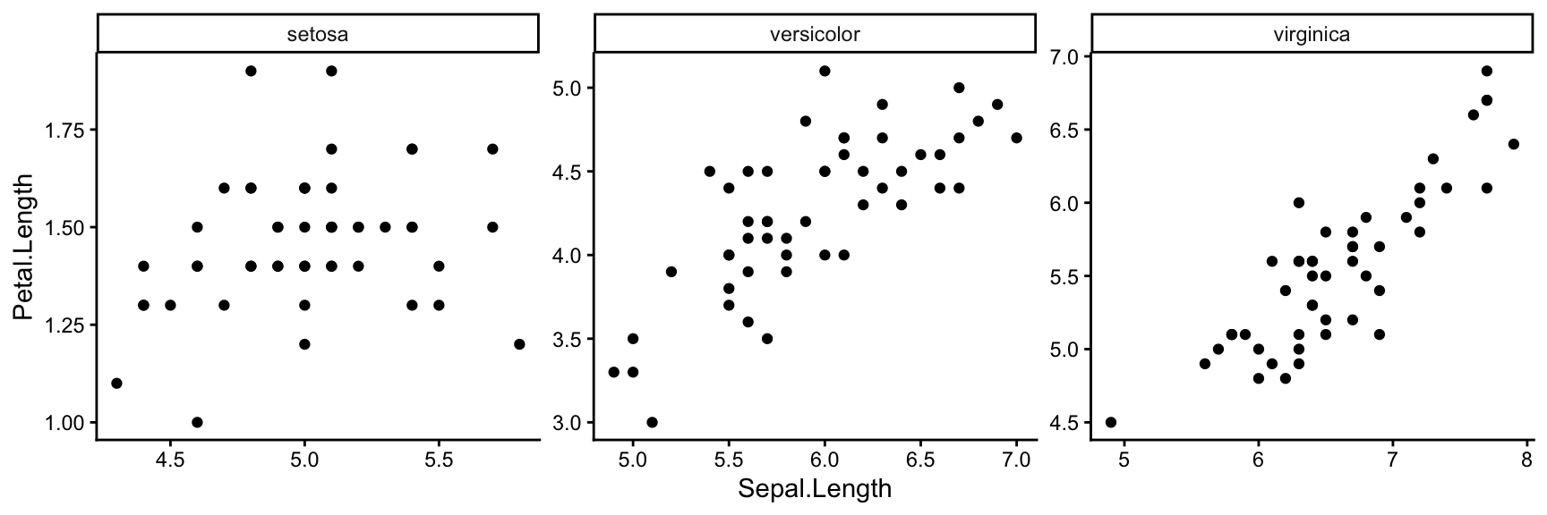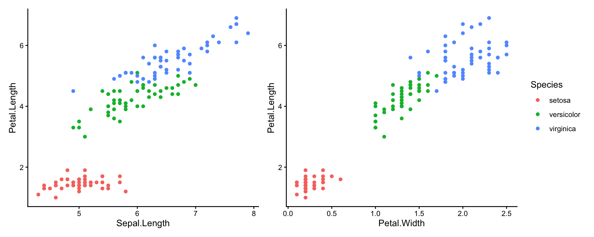 p1 <- ggplot(iris, aes(Sepal.Length, Petal.Length, colour = Species)) +