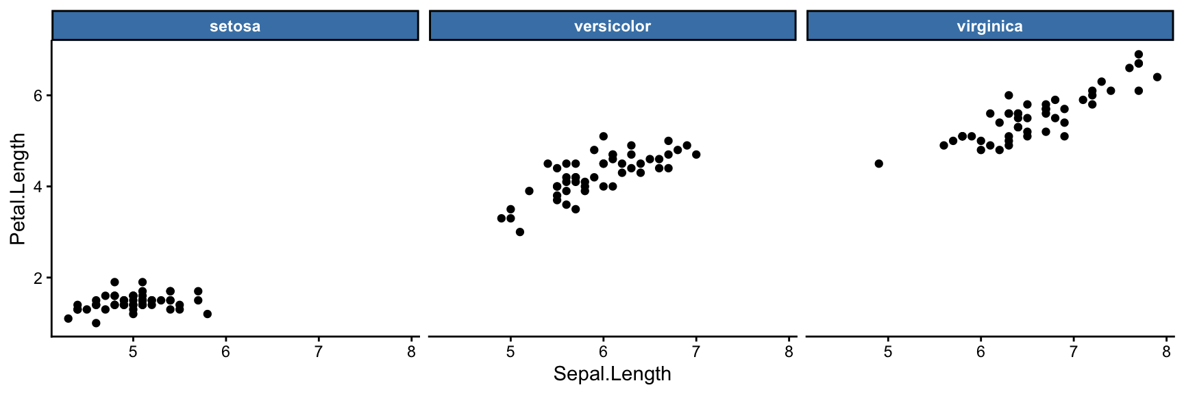 The formula syntax ~ variable specifies which variable to split on. For example, to make a separate scatter plot for each iris species: