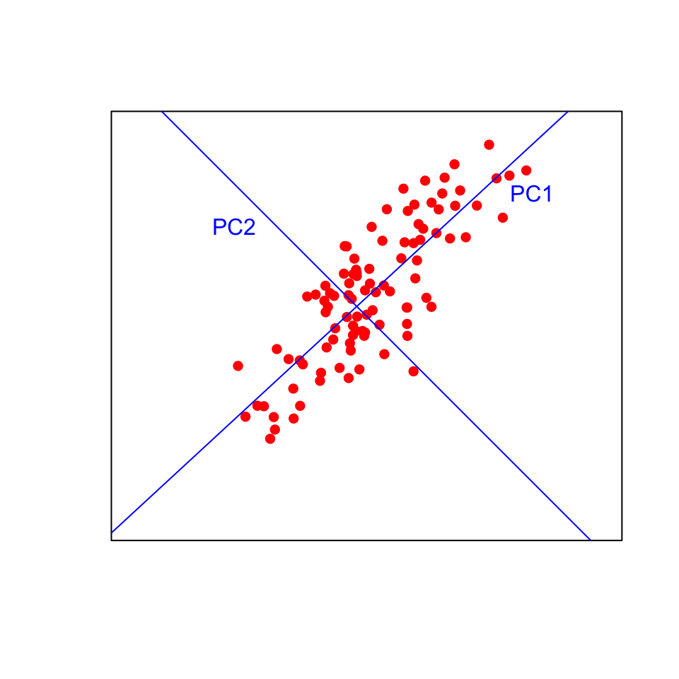 Visualising this in two dimensions helps to understand the approach. The data points will be plotted on the new blue axes (the principal components) rather than the original black axes. Now imagine fitting those lines in more than three dimensions!