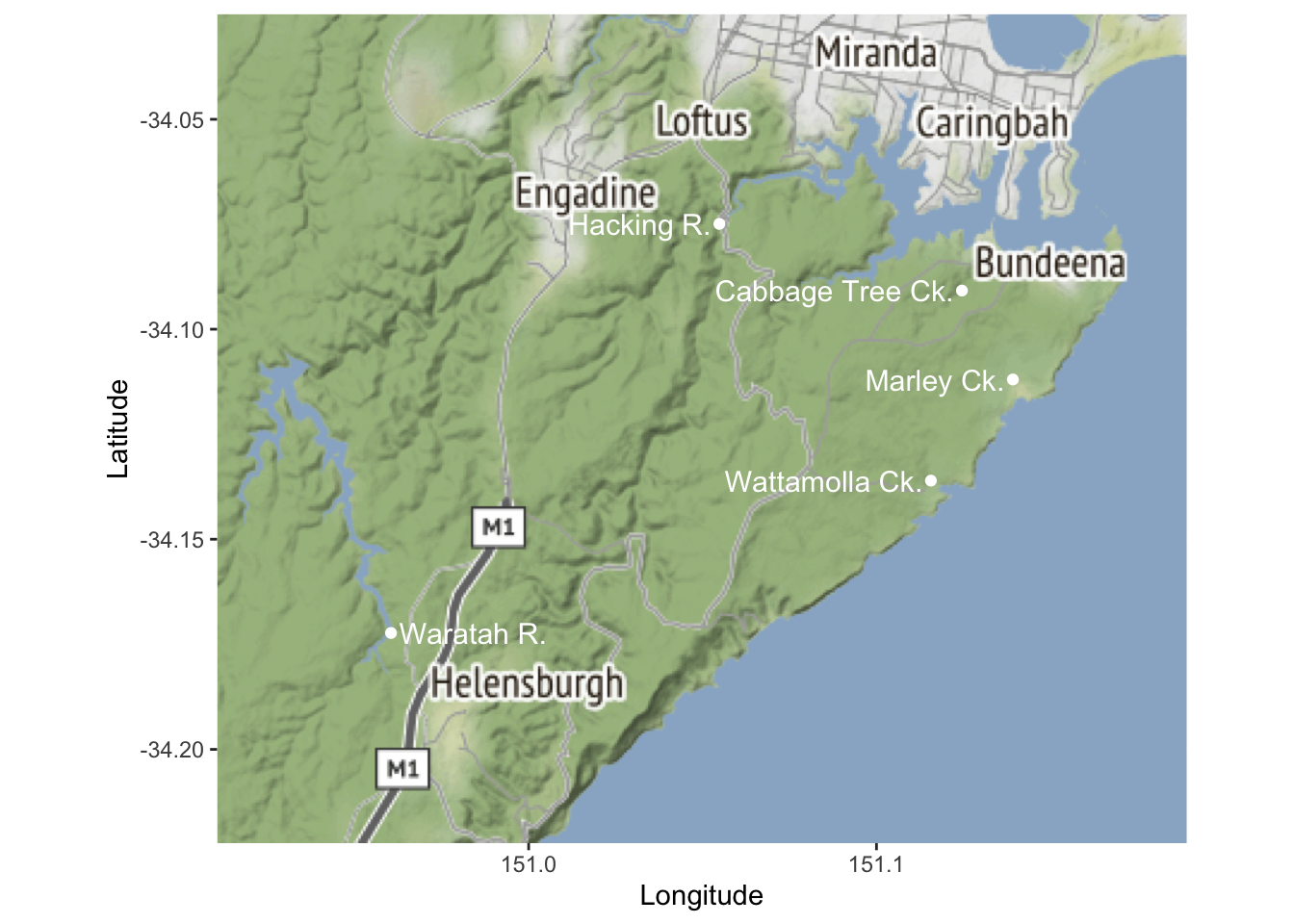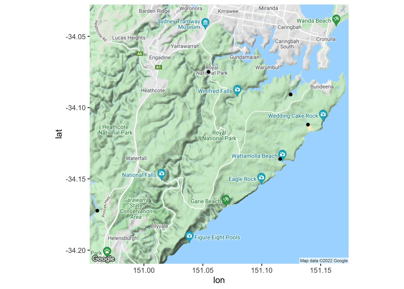 In this example, let’s say we collected data from five sites near Royal National Park in New South Wales, Australia, and want to display the locations we visited.