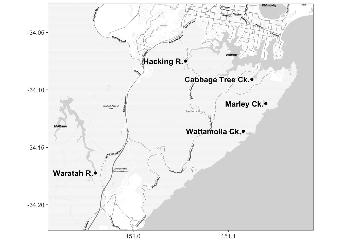 " Hacking R. ", " Cabbage Tree Ck. ",