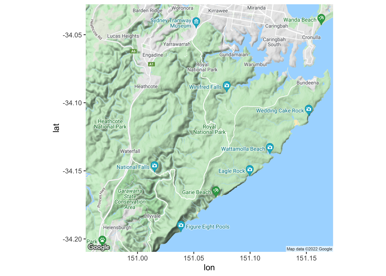 The argument of get_map is simply any place searchable on Google Maps (in this case ‘Royal National Park’) - easy!