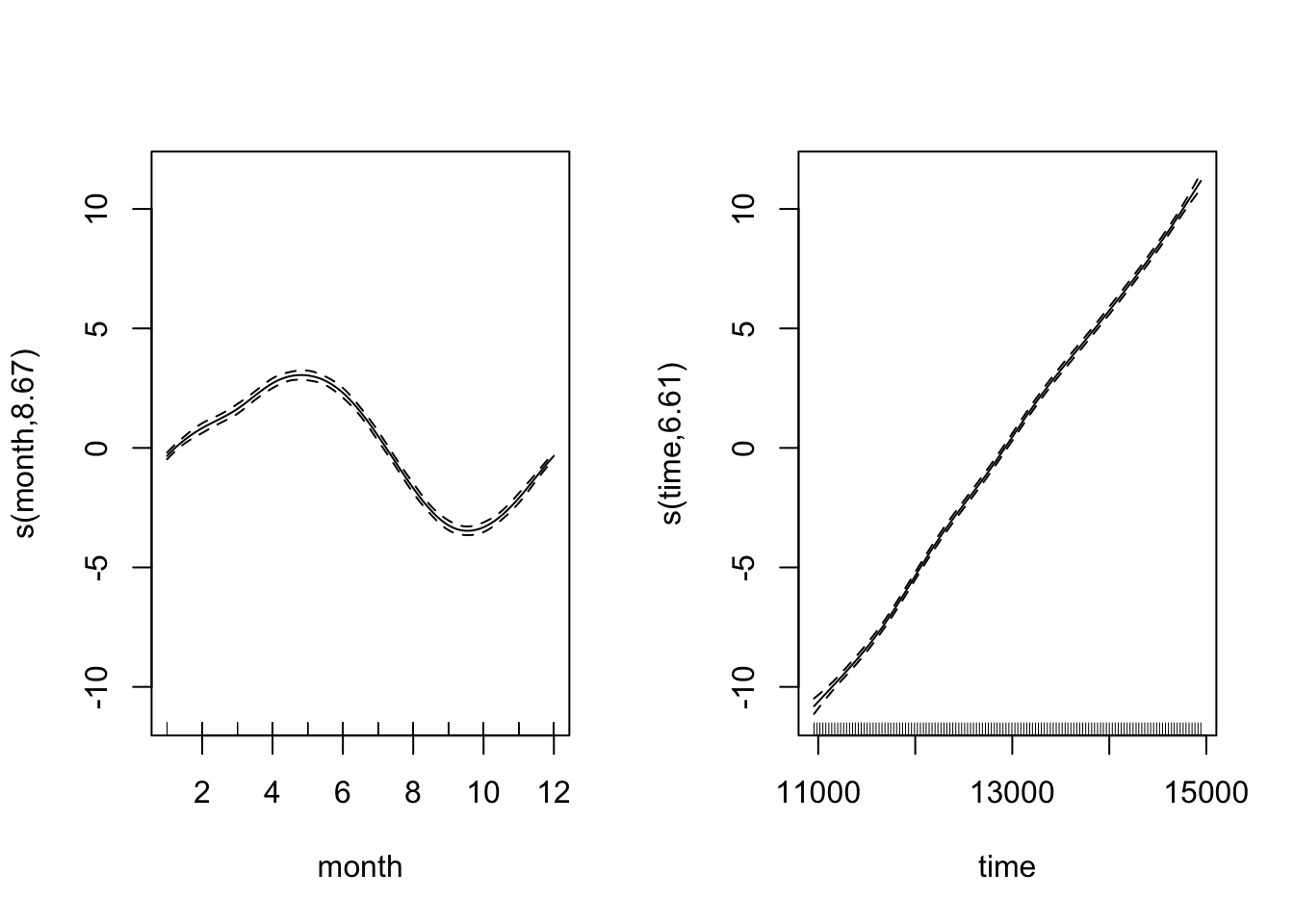 CO2_season_time <- gam(co2 ~ s(month, bs = "cc", k = 12) + s(time), data = CO2_dat, method = "REML")
