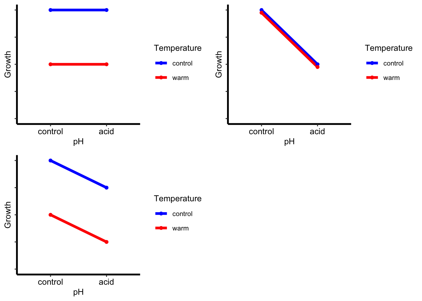 For simplicity, let’s consider just two levels of each treatment: a control and warmed treatment for temperature and a control and acidified treatment for pH. Corals would be grown in all four combinations. These three plots for coral growth illustrate scenarios where the two factors of temperature and pH do not interact.