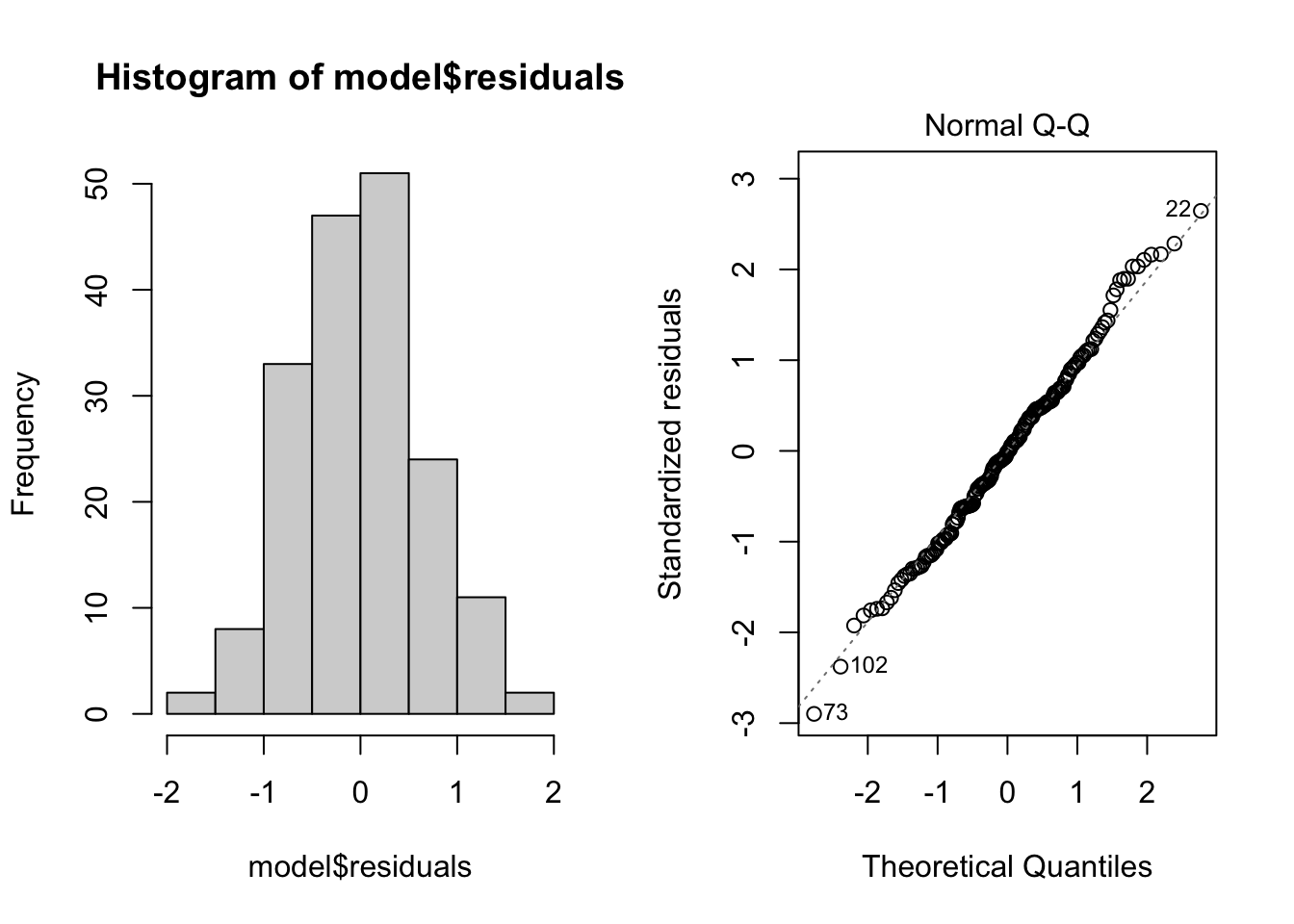 Normality. Checks of whether the data are normally distributed are usually performed by either plotting a histogram of the residuals or via a quantile plot where the residuals are plotted against the values expected from a normal distribution (the second of the figures obtained by plot(model). If the points in the quantile plot lie mostly on the line, the residuals are normally distributed. Violations of normality can be fixed via transformations or by using a different error-distribution in a GLM. Note, however, that linear regression is reasonably robust against violations of normality.