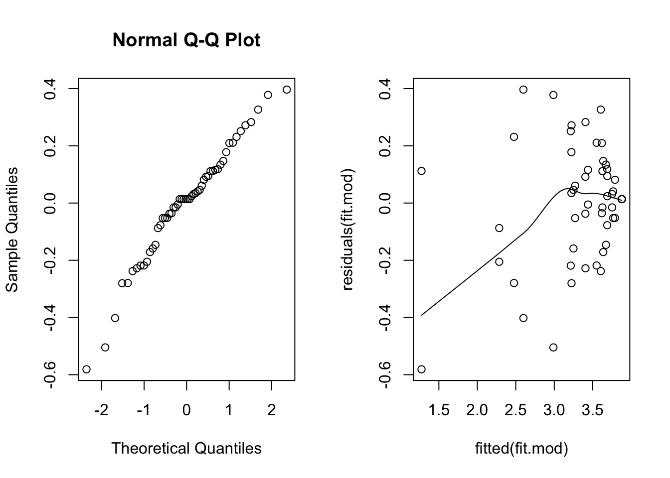 This scatterplot is much better, the fan shape is all but gone. The smooth line is below zero on the left, but there are relatively few points there, so it’s not of great concern.