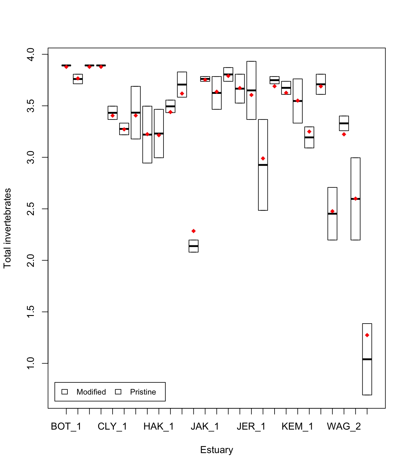 boxplot(log(Total) ~ SiteWithin, data = Estuaries, col = cols, xlab = "Estuary", ylab = "Total invertebrates")