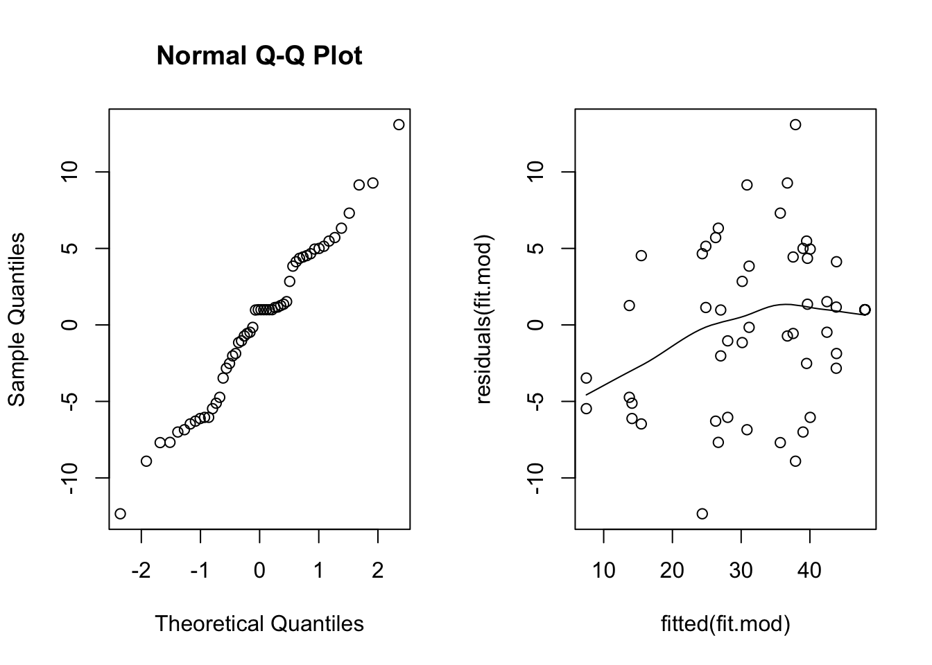 scatter.smooth(residuals(fit.mod) ~ fitted(fit.mod)) # residual plot