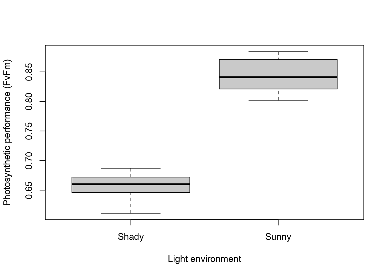 boxplot(Performance ~ Treatment, data = Greenhouse, xlab = "Light environment", ylab = "Photosynthetic performance (FvFm)")
