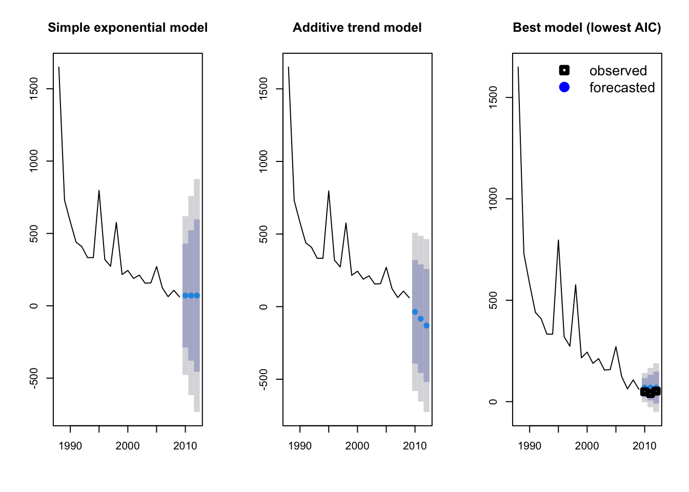 We can compare the simple exponential model with the model incorporating the additive trend by plotting them side by side.