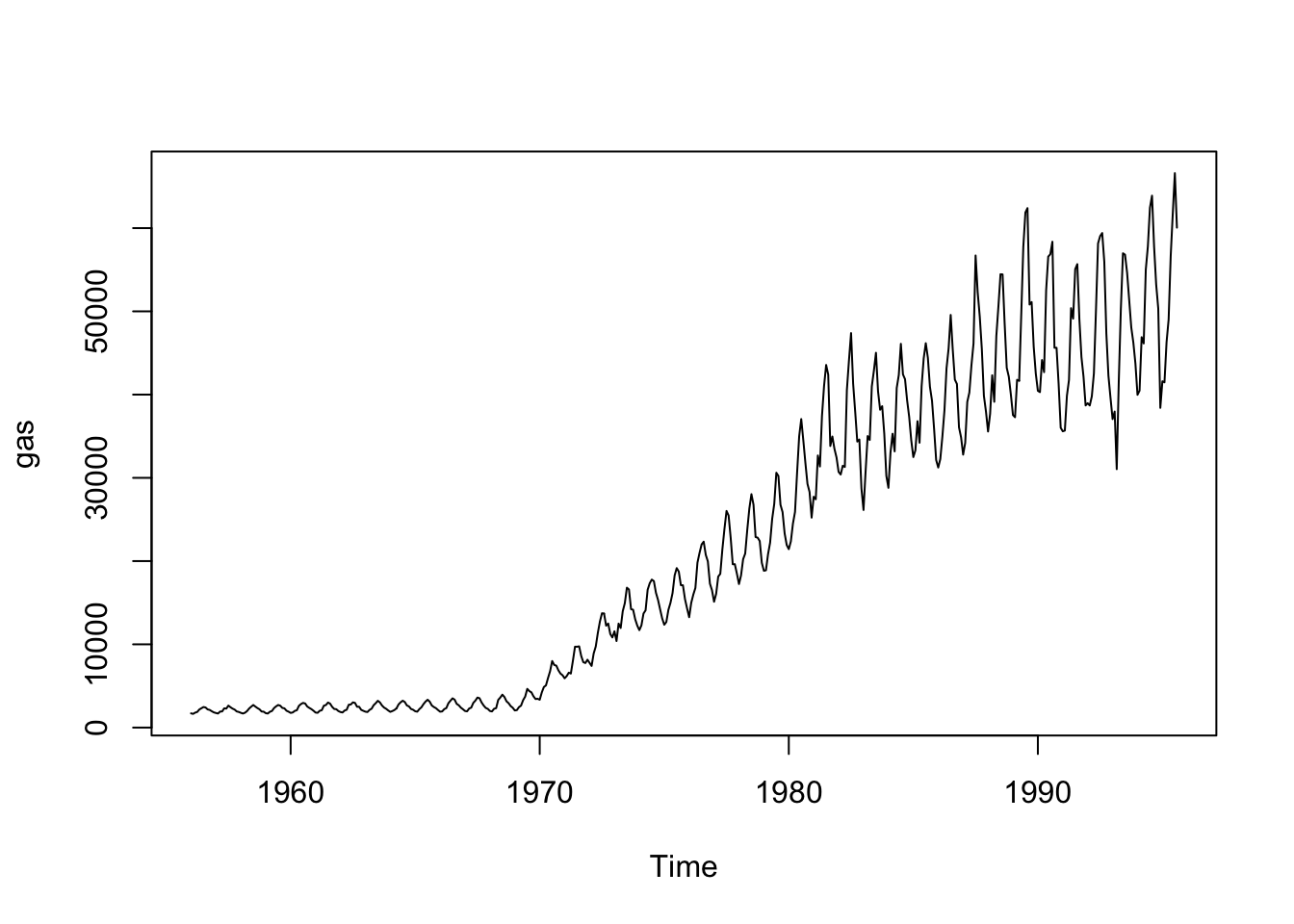 Let’s try another example that incorporates not only long-term trends but also seasonal variability. We will use an example used in Rob Hyndman and George Athanasopoulos’ online textbook and included in the forecast package: Australian monthly gas production. We will start by plotting the historical data from 1956 to 1995. If we plot the data, we can see two patterns: an overall positive trend and a zig-zagging seasonal pattern.